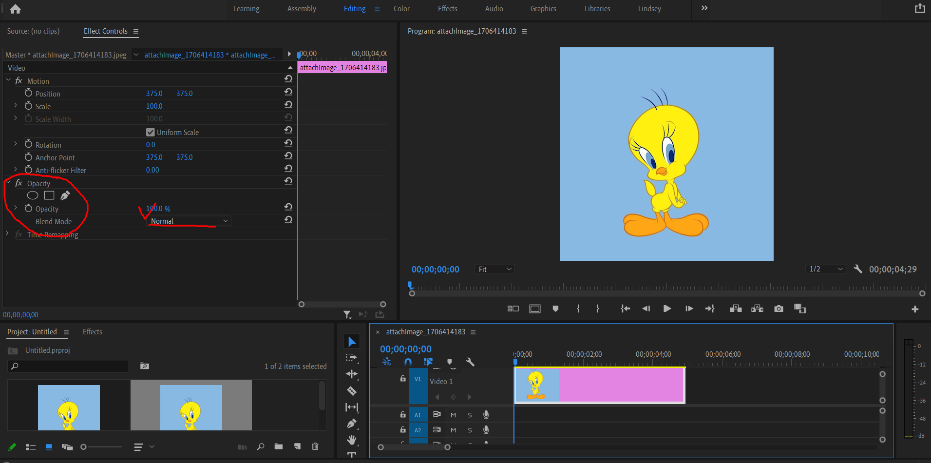 소스 창 - Effect controls - Opacity - Blend mode
