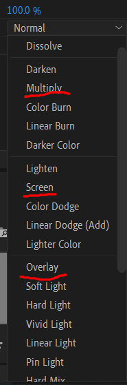 여러 가지 옵션이 있는데 보통 멀티플라이(Multiply), 스크린(Screen), 오버레이(Overlay)